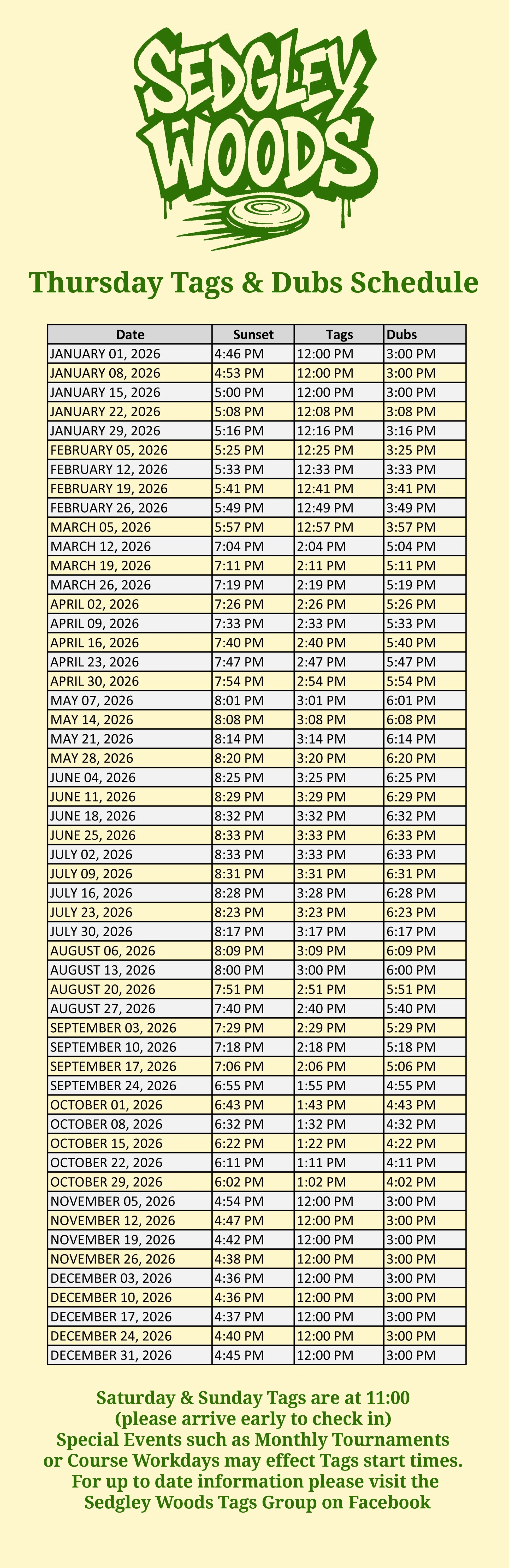 When sunset is before 5pm Tags will be at NOON & Dubs at 2:00pm